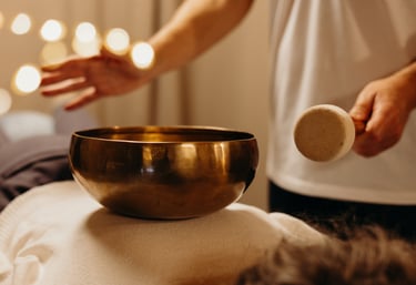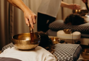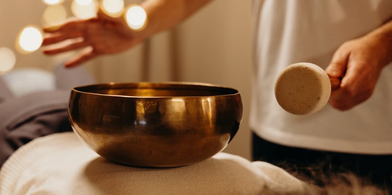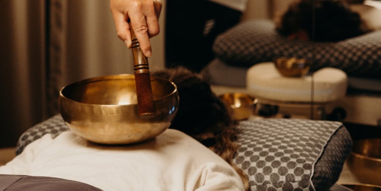 Bei einer Klangschalenmassage werden verschiedene Schalen auf und um den bekleideten Körper gestellt und sanft angeschlagen.